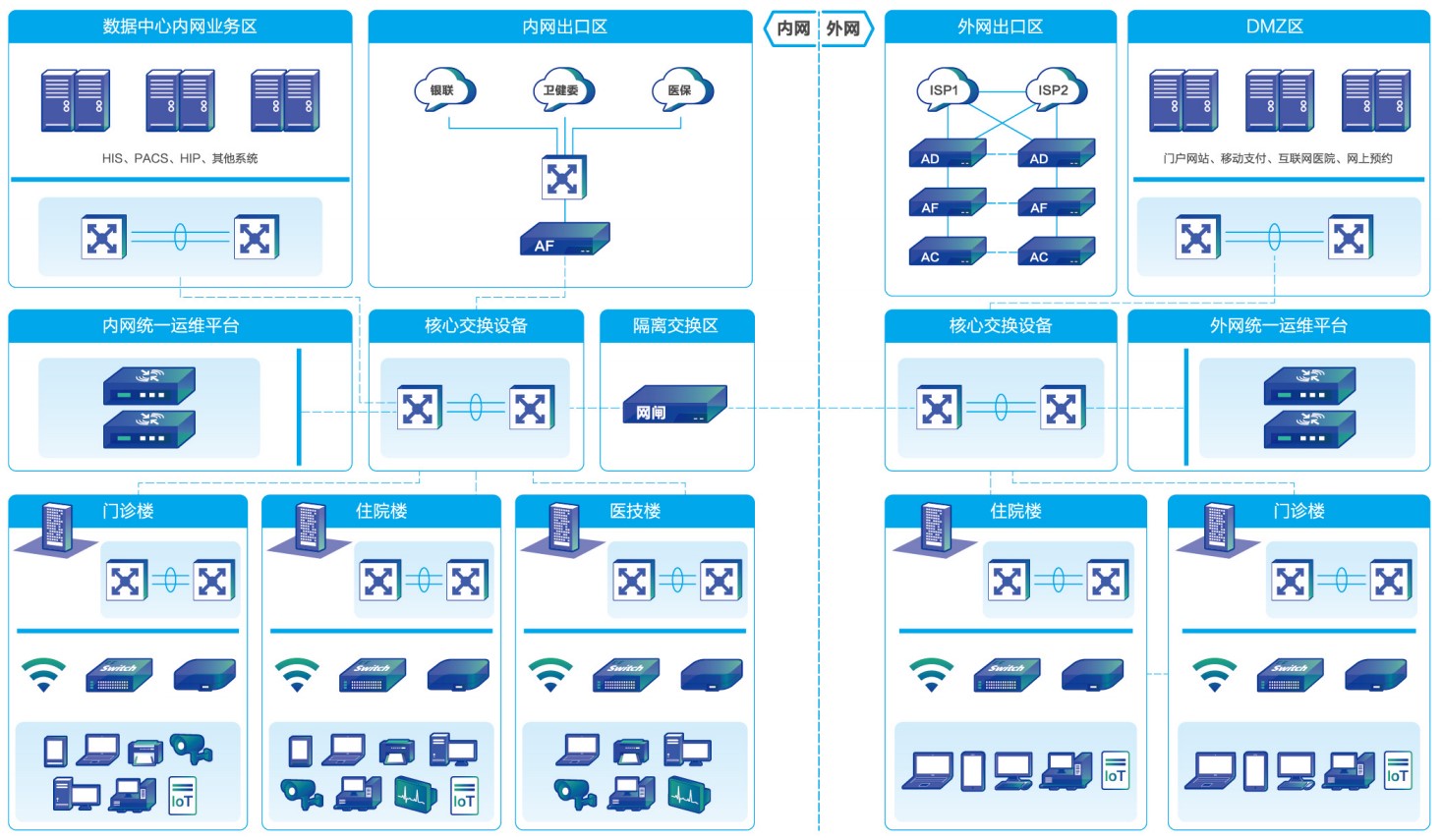 医院基础网络一般包括三张网络的建设方式,分别是内网、外网和设备网,均采用物理隔离方式,内外之间由于移动支付和在线挂号等业务需要与HIS等系统打通,通常中间会放网闸进行隔离。网络覆盖通常分为门诊部、住院部和医技楼几个部分,当然也可能包含其他区域,比如一些室外的公共区域。